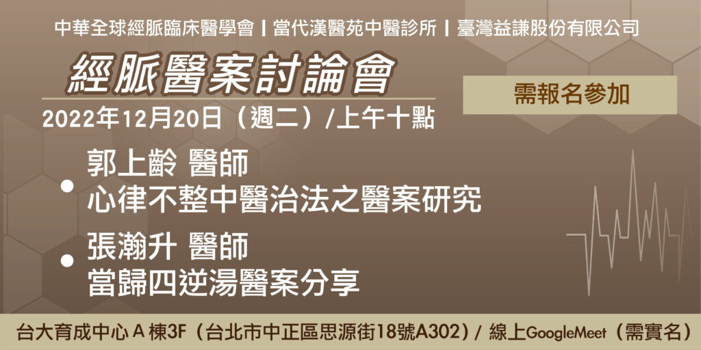 111/12/20日(週二上午十點) 經脈醫案討論會 活動報名 報名請往 分享此文章: 在 電子郵件 分享 在 Facebook 分享 在 Line 分享 複製至剪貼簿 上一 文章 111/12/11週日 新冠病毒感染的六經傳變 - 高雄榮民總醫院免費講座 下一 文章 2023年5/28日14:00-17:00 中華全經經脈臨床醫學會- 會員大會與研討會演講活動